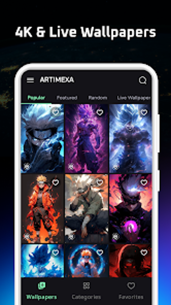 4K และ Live Wallpapers: Artimexa เป็นศูนย์กลางสุดยอดสำหรับภาพพื้นหลัง 4K คุณภาพสูงและภาพพื้นหลังแบบไลฟ์ไลฟ์บน Android ด้วยหมวดหมู่ที่หลากหลายรวมถึง อนิเมะ กีฬา ศิลปะ วันหยุด รถยนต์ เพลง ธรรมชาติ ภาพยนตร์ มีมส์ เกมส์ การ์ตูน ยานพาหนะ สัตว์ และสถานะความสวยงาม แอปพลิเคชันนี้เพียงพอสำหรับทุกความพอใจ สนุกกับภาพที่ชัดเจนที่ถูกปรับแต่งให้เหมาะสำหรับความละเอียด 4K และให้ชีวิตให้หน้าจอของคุณด้วยภาพพื้นหลังแบบไลฟ์ไลฟ์ ตั้งค่าภาพพื้นหลังที่ชื่นชอบได้อย่างง่ายดายและสร้างคอลเล็กชันส่วนตัวโดยใช้คุณลักษณะที่ชื่นชอบ ไม่ว่าคุณจะเป็นสาวกอนิเมะ คนรักกีฬา หรือนักศิลปะ Artimexa มอบสิ่งที่เหมาะสำหรับทุกคน